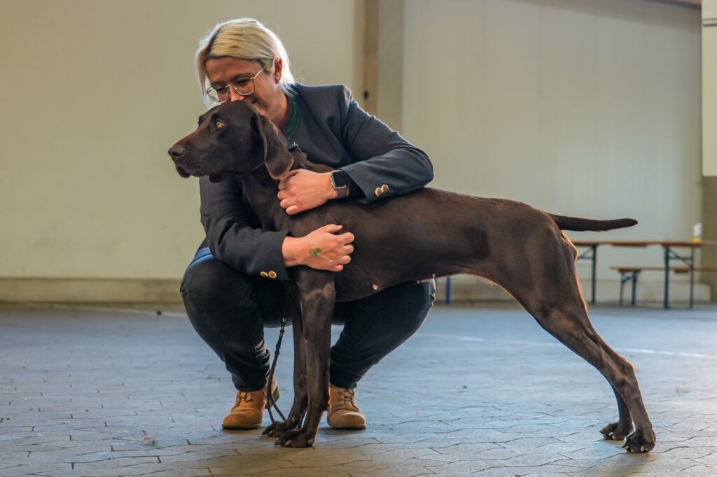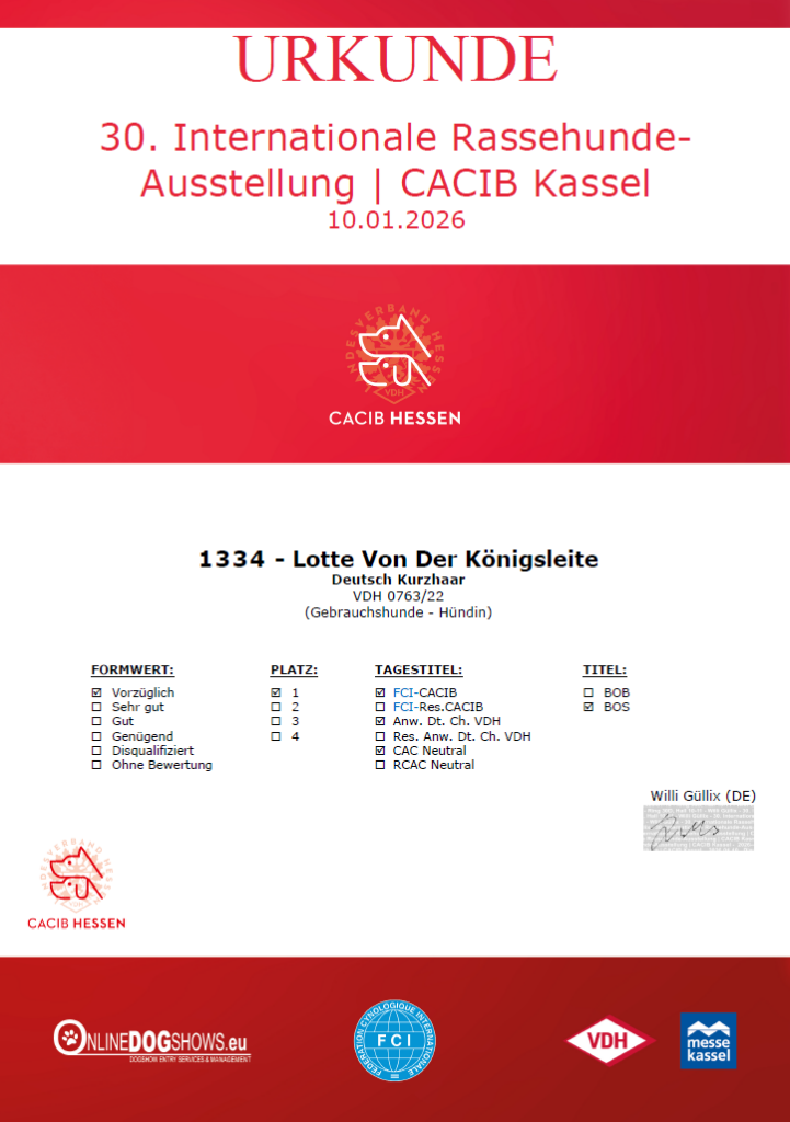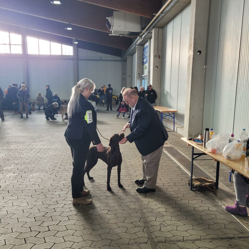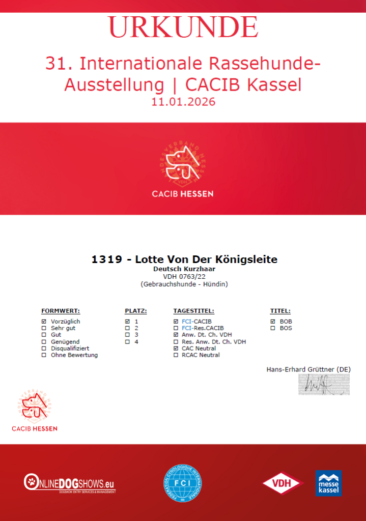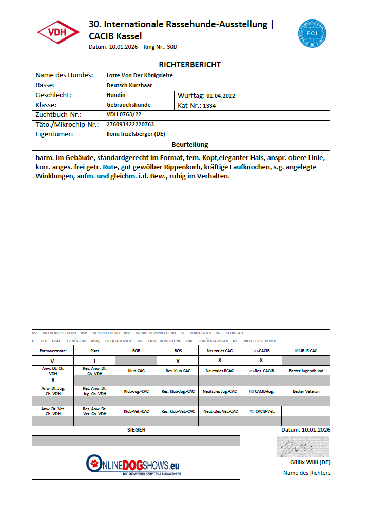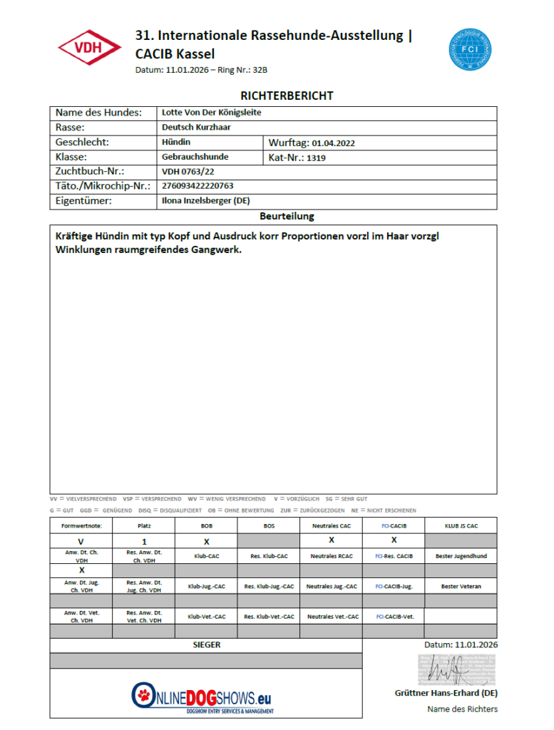 Das hätten wir nicht erwartet! Wir wollten mit Lotte nochmals zu einer VDH-Ausstellung, bevor sie ggf. einen Wurf hat. Dass sie eine hübsche Hündin im Standard ist, wissen wir. Sie hatte beim DK-Franken Formwert V1 und anl. der IKP 2026 V2.