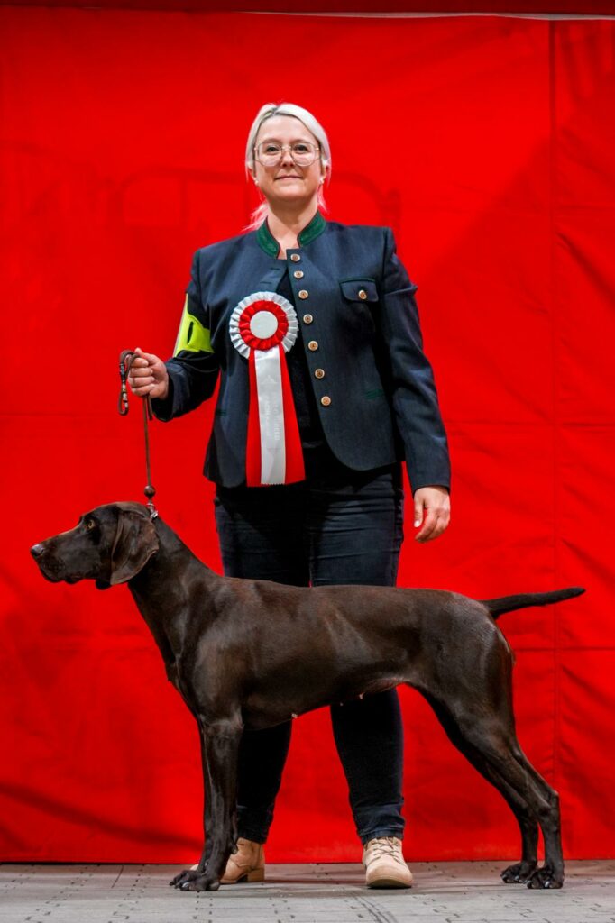 Am 2. Tag konnte sie sogar einen Rüden der Championklasse übertrumpfen und erhielt das BOB der Rasse Deutsch-Kurzhaar!