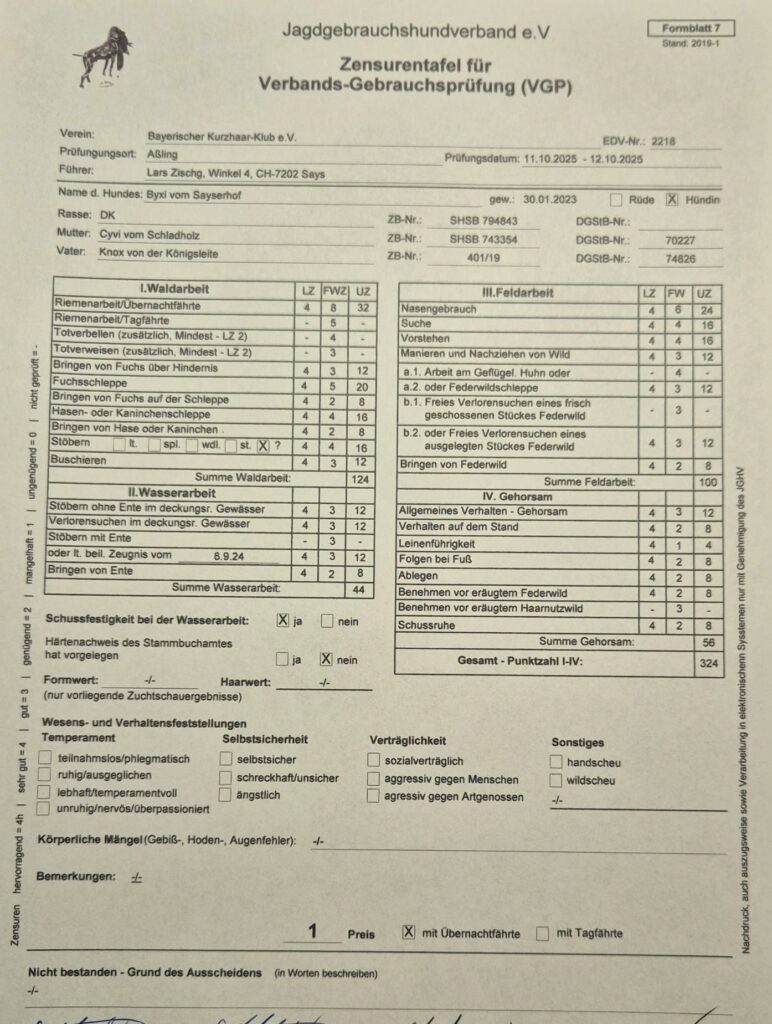 D1, S1 (Suchensieger), VGP I 315 P./ÜF (ohne Gehorsam a. Haarwild),