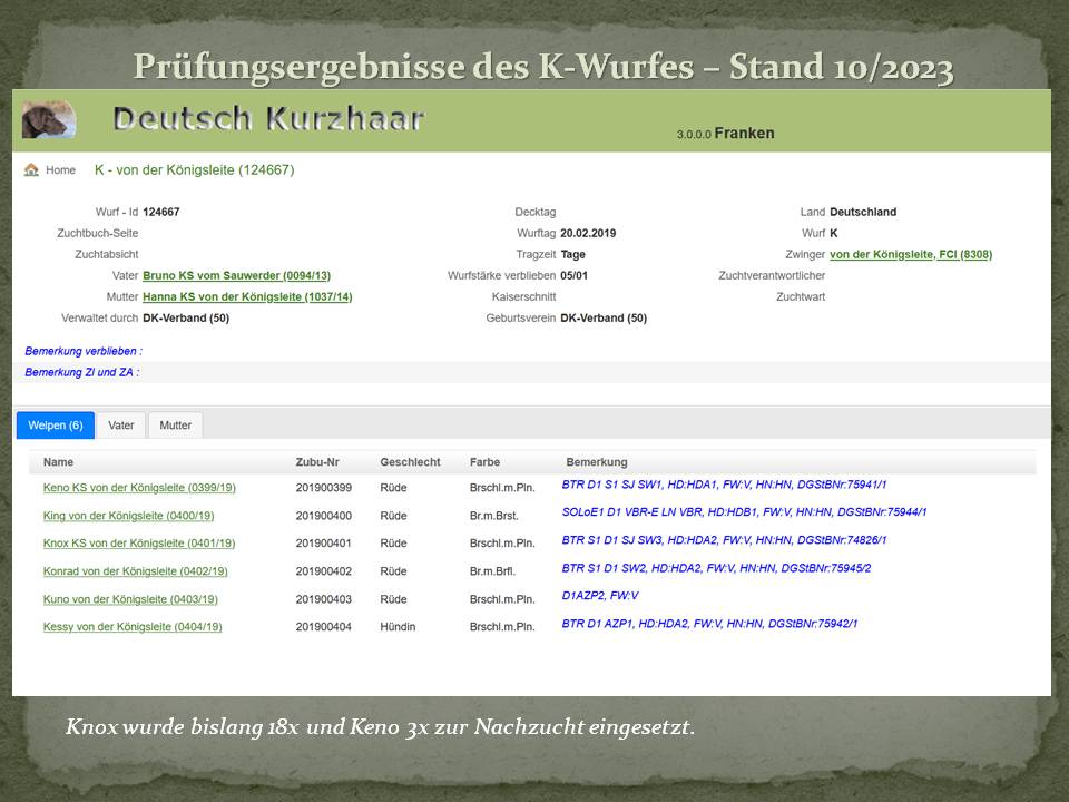 KenoKingKnoxKonradKunoKessyDie Welpen sind tolle Jagdhunde geworden – das freut uns sehr!Keno – D1,S1,VGP1,HN,Btr,SJ, HD A1, ED/OCD frei – Fw:VKing – D1,SoloE1, Vbr E,VGP1,HN, HD B1, ED/OCD frei -FW:VKonrad – D1,S1,VGP2,HN,BTR, HD-A2, ED/OCD frei – Fw: VKnox – D1, S1, VGP1, BTR, HN, SJ, LN, HD A2, ED/OCD frei – Fw:VKuno – D1, AZP2, Fw: VKessy – D1, AZP1, VGP1, HN, BTR, HD-A2, ED/OCD frei – Fw:V